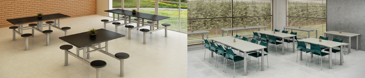 Mesa Refeitório 6 Lugares, Banco Acoplado Inteiriço, Estrutura em Aço