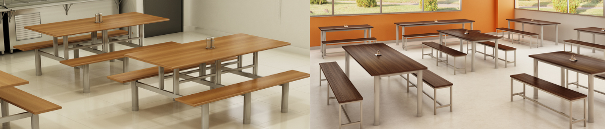 Mesa Refeitório 4 Lugares, Banco Acoplado Fixo Individual, Estrutura em Aço