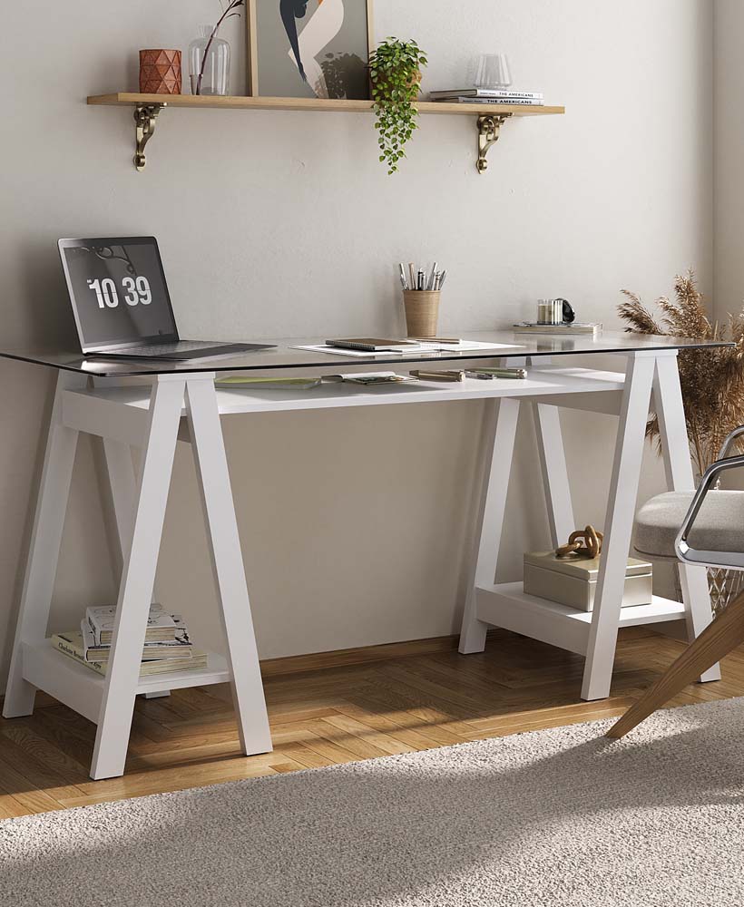Escrivaninha Cristal, Tampo em Vidro – Pés Cavalete – Branco – Home Office