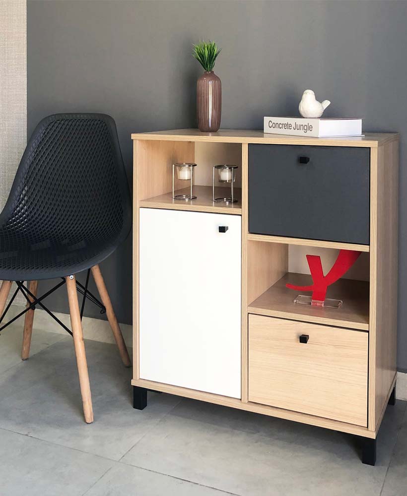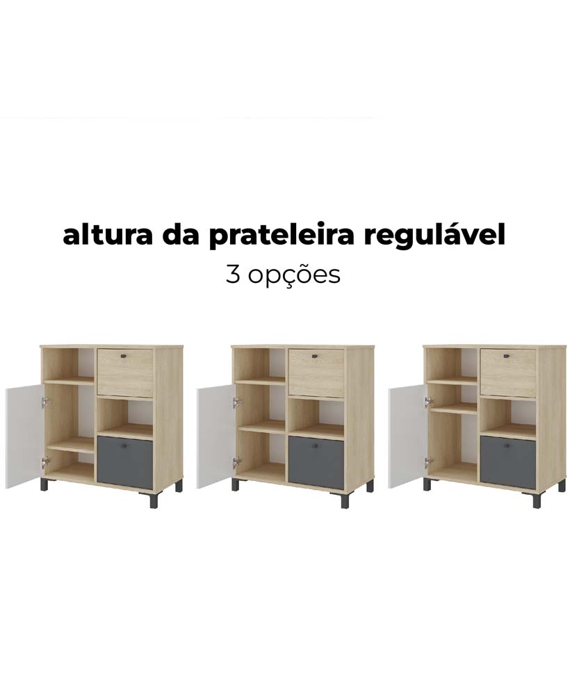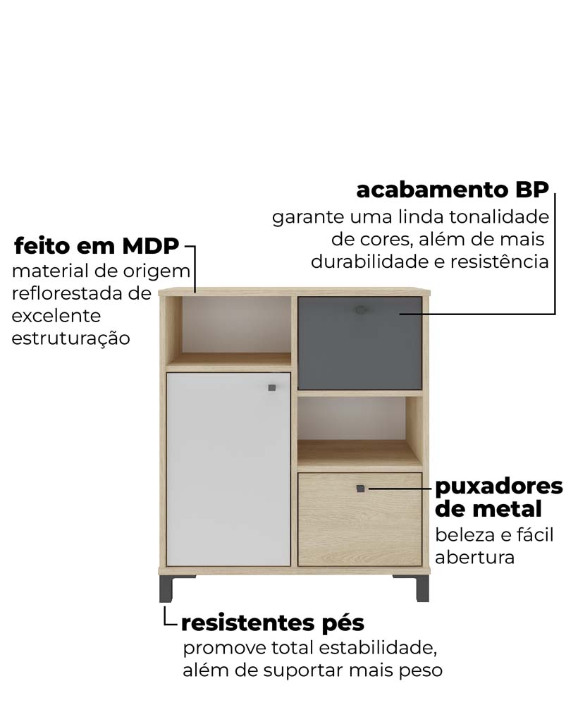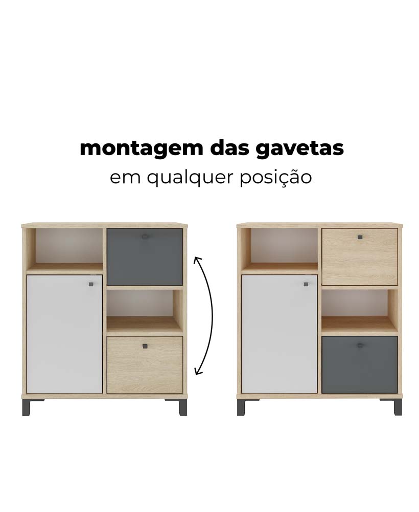 Balcão 02 Gavetões e 01 Porta – Nordik – Cor Carvalho/Branco/Grafite – Home Office