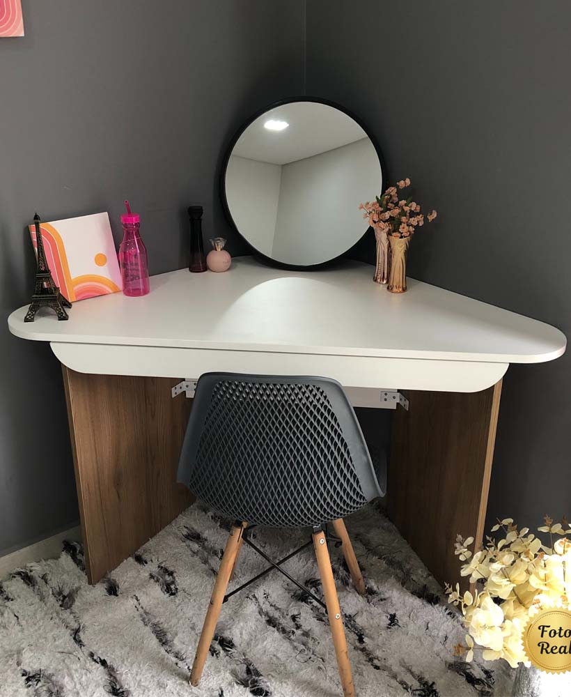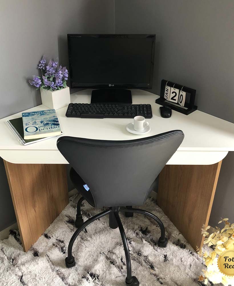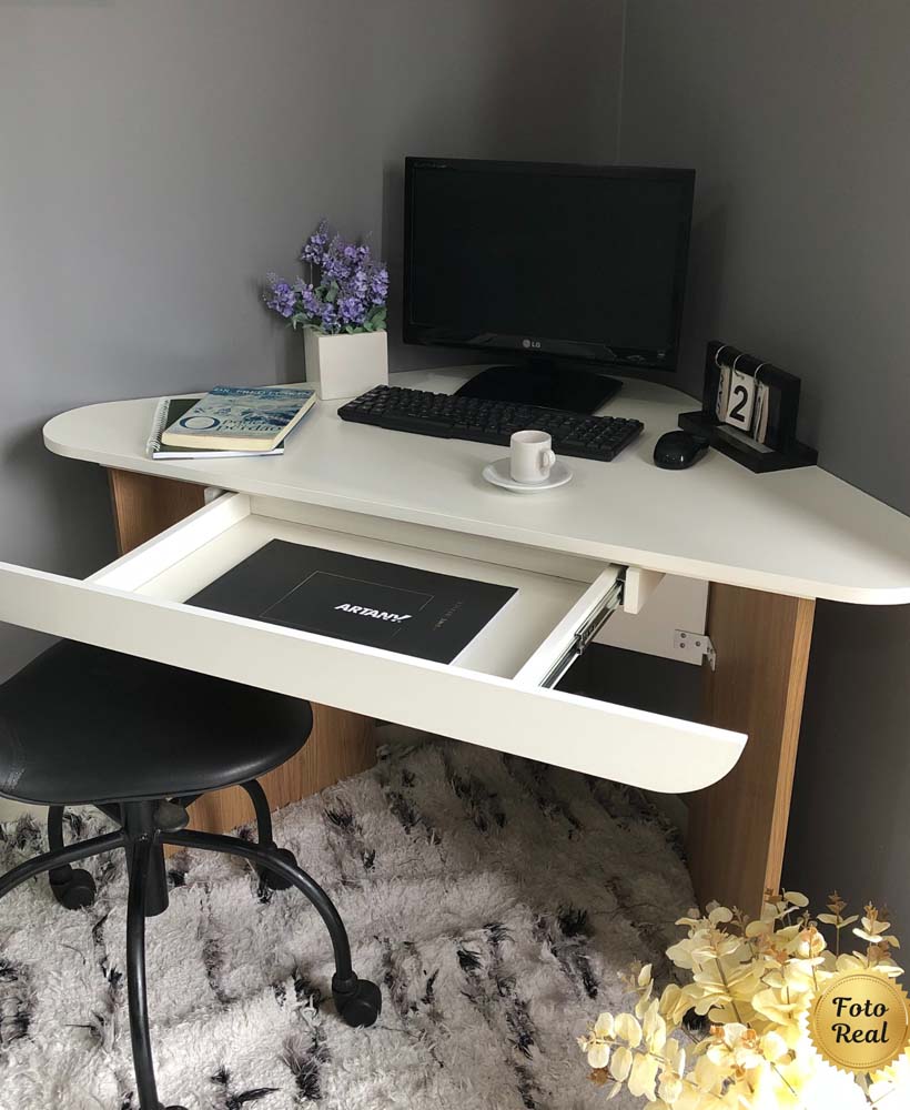 Uma escrivaninha de canto é uma solução inteligente para quem busca otimizar o aproveitamento do ambiente, encaixando-se perfeitamente em cantos e proporcionando uma área de trabalho ampla, funcional e bem organizada, ideal tanto para estudos quanto para atividades profissionais.