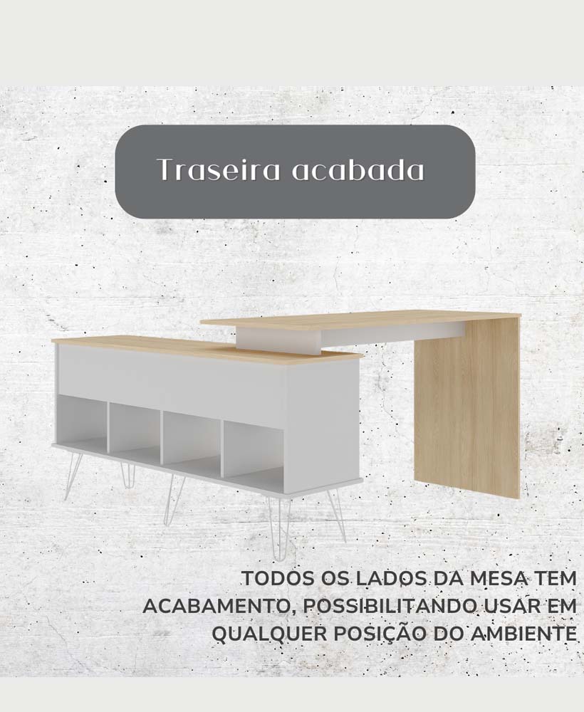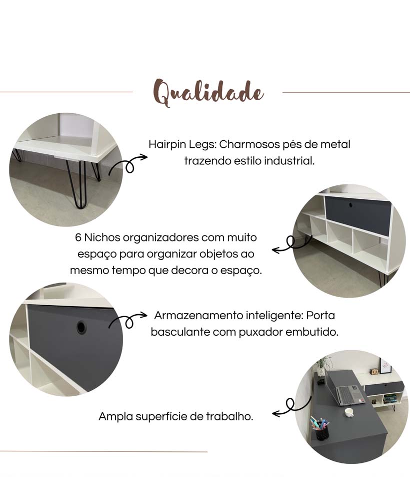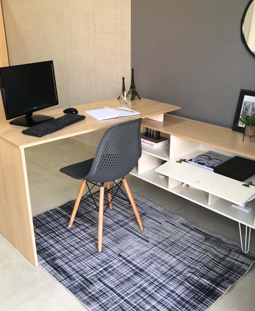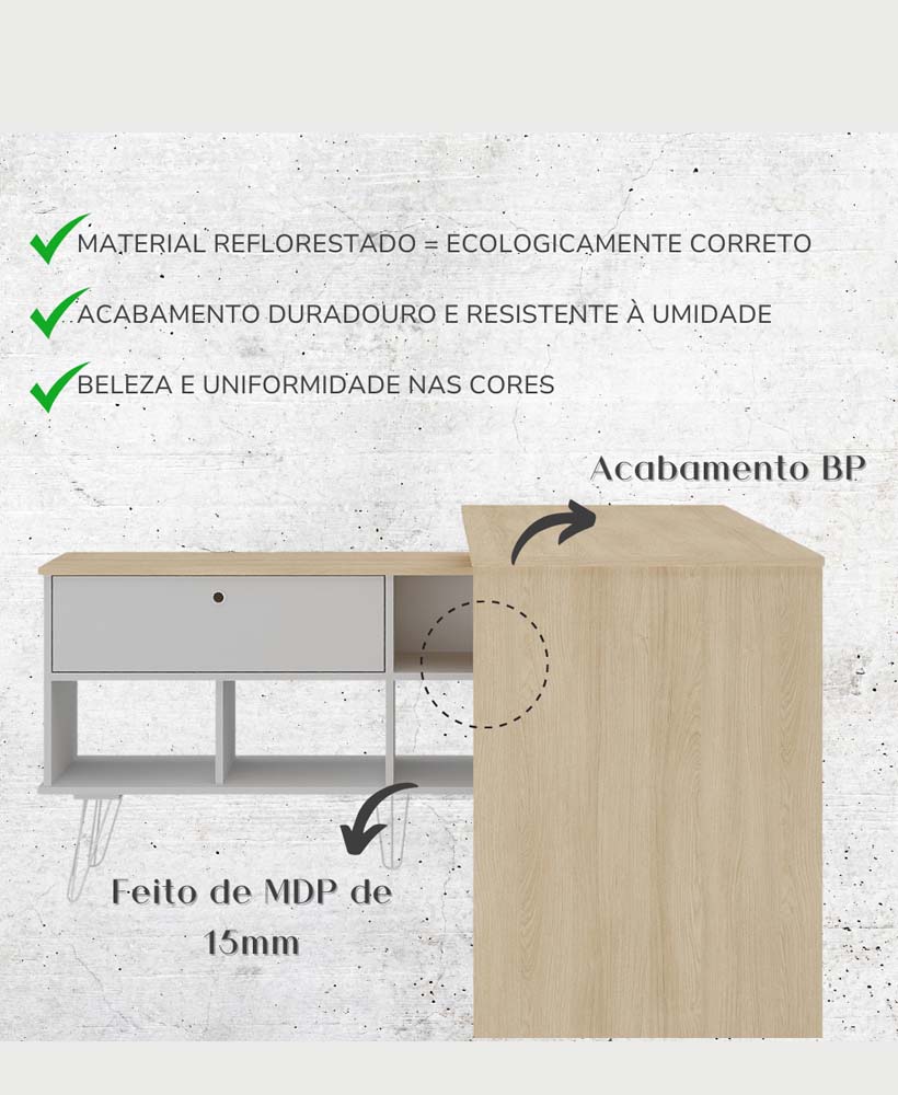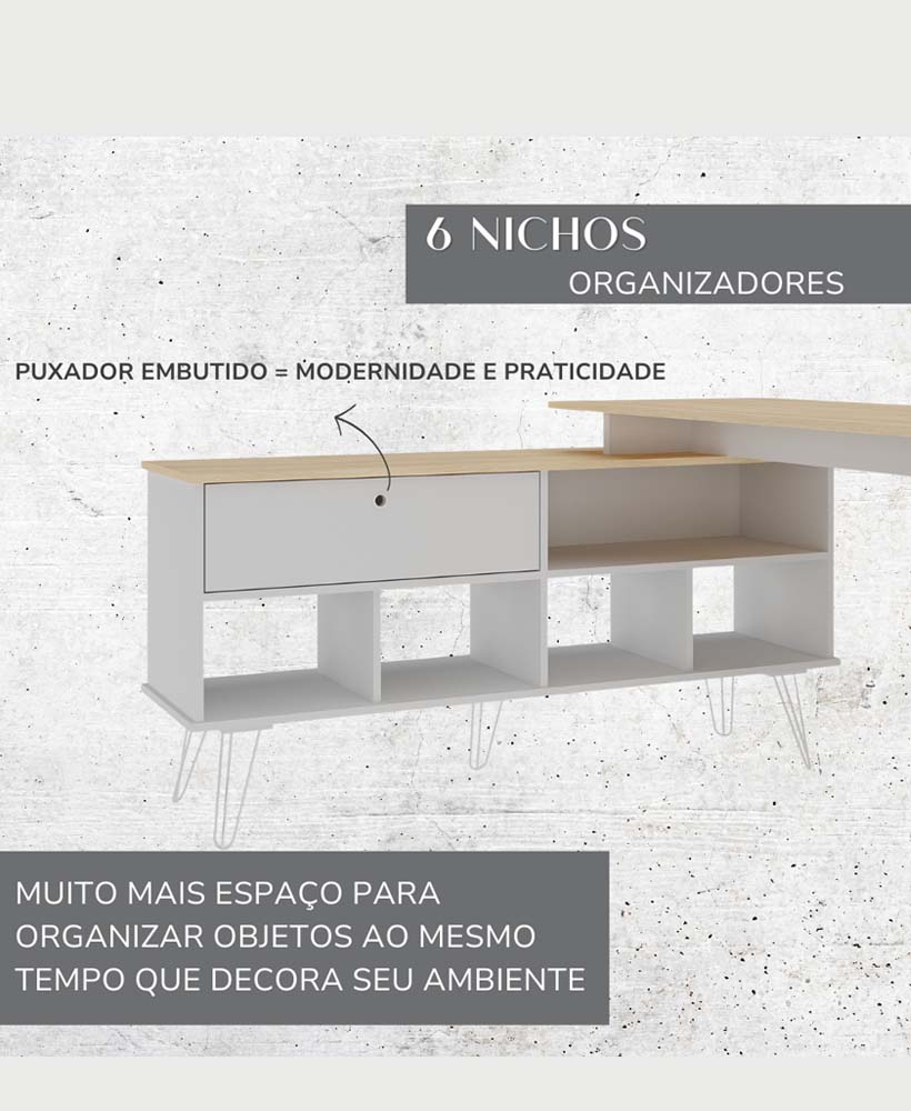 Transforme seu ambiente em um espaço mais bonito e produtivo com esta elegante Escrivaninha em L, perfeita para tornar seus momentos de trabalho ou estudo mais agradáveis.