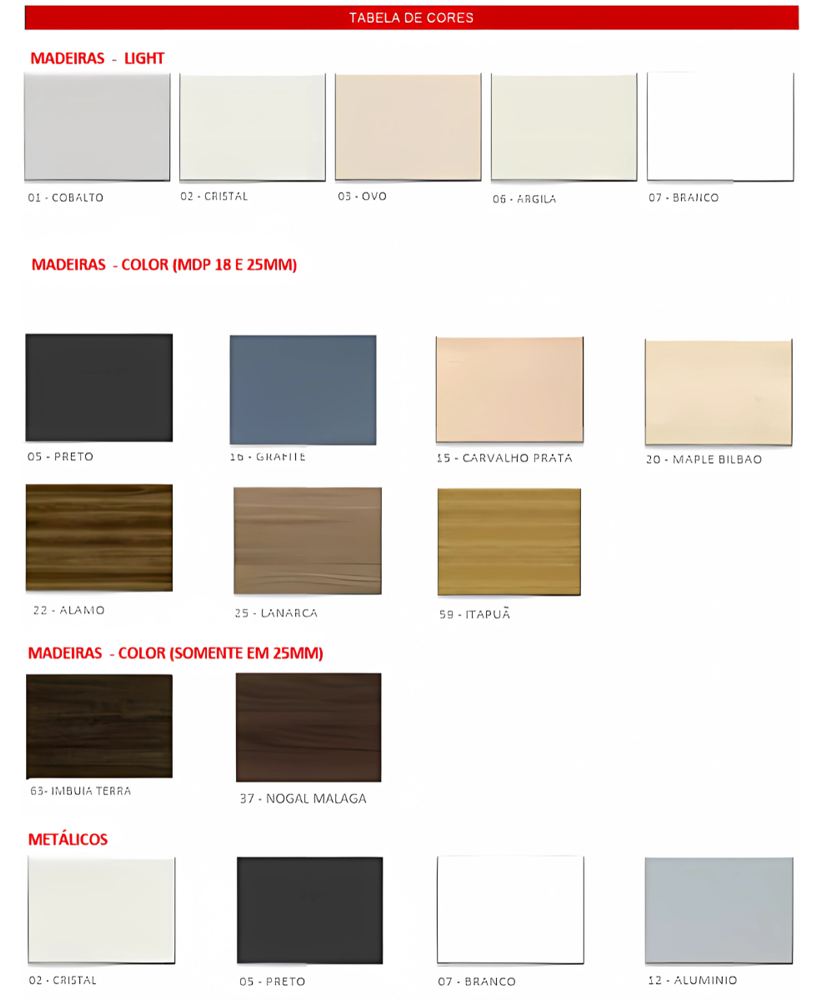• Preto / Grafite / Carvalho Prata / Maple Bilbao / Alamo / Lanarca / Itapuã