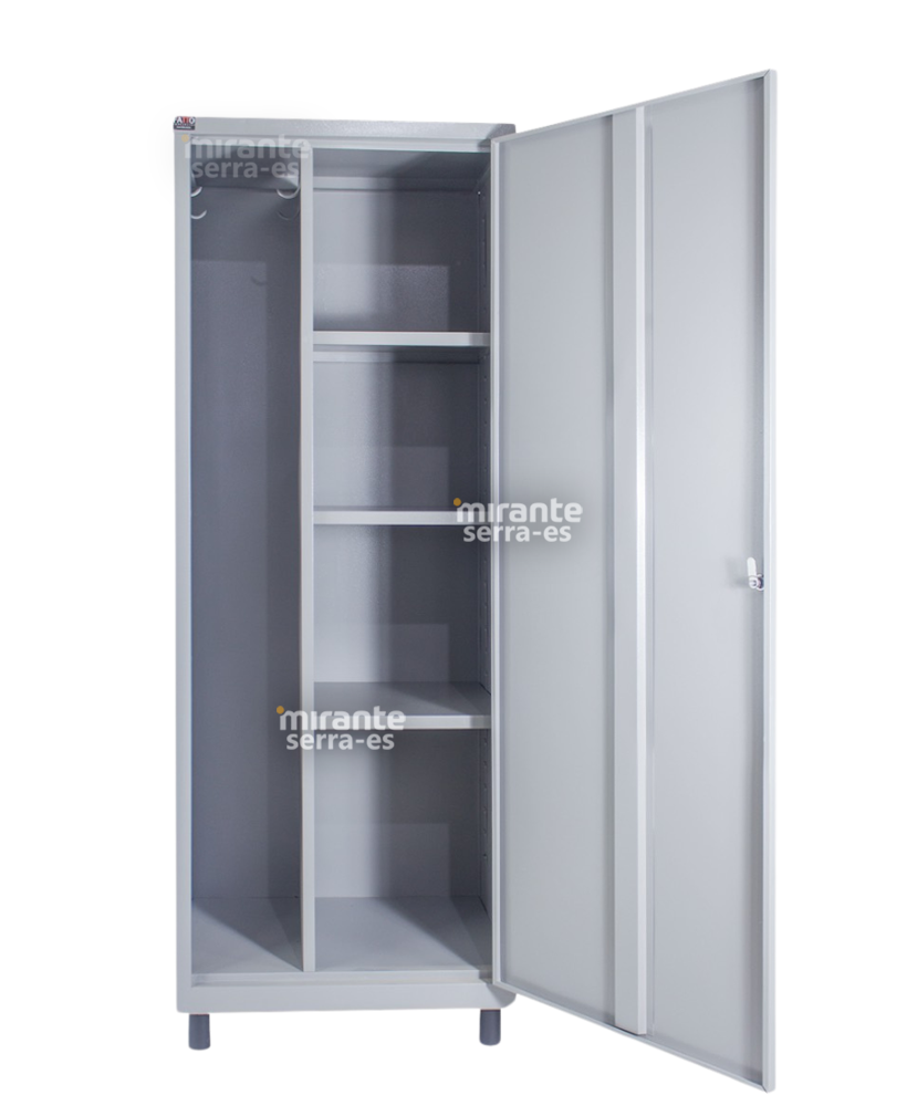 Além disso, o roupeiro possui sapatas plásticas em sua base, que ajudam a proteger o piso contra riscos e garantem estabilidade ao móvel. Essas sapatas também evitam o contato direto do metal com o solo, prevenindo possíveis danos e prolongando a vida útil do produto.